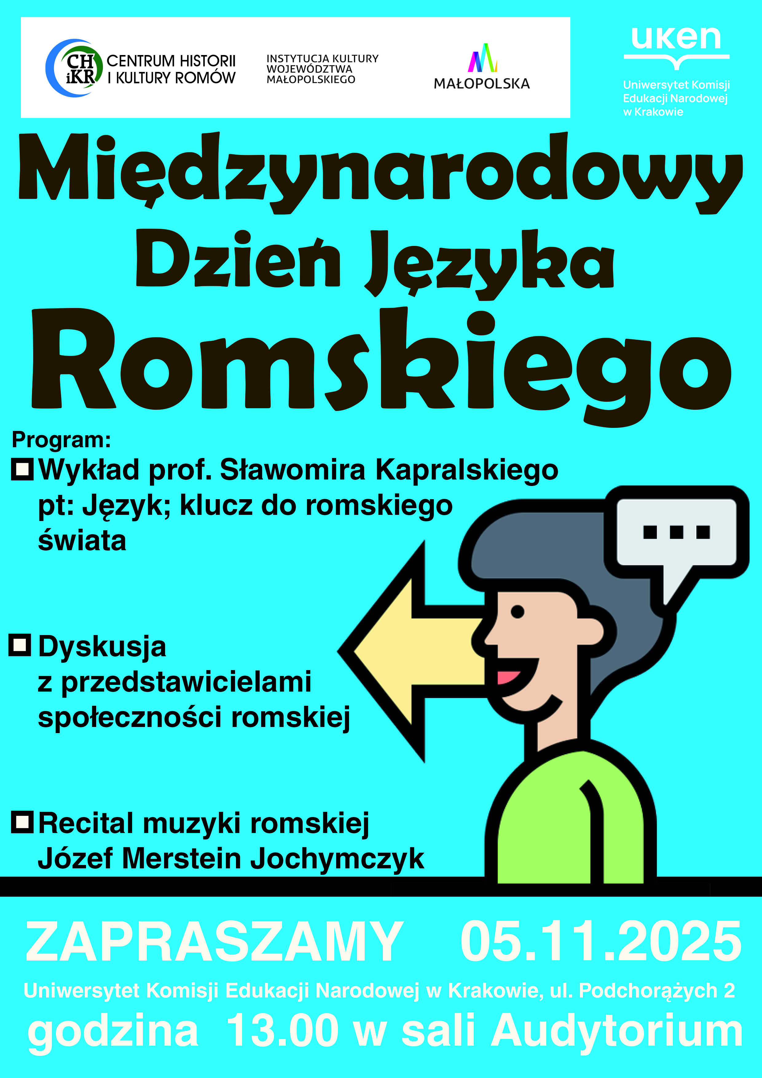 Centrum Historii i Kultury Romów zaprasza na obchody Międzynarodowego Dnia Języka Romskiego, które odbędą się 5 listopada 2025 roku o godz. 13:00 w Audytorium Uniwersytetu Komisji Edukacji Narodowej w Krakowie przy ul. Podchorążych 2.