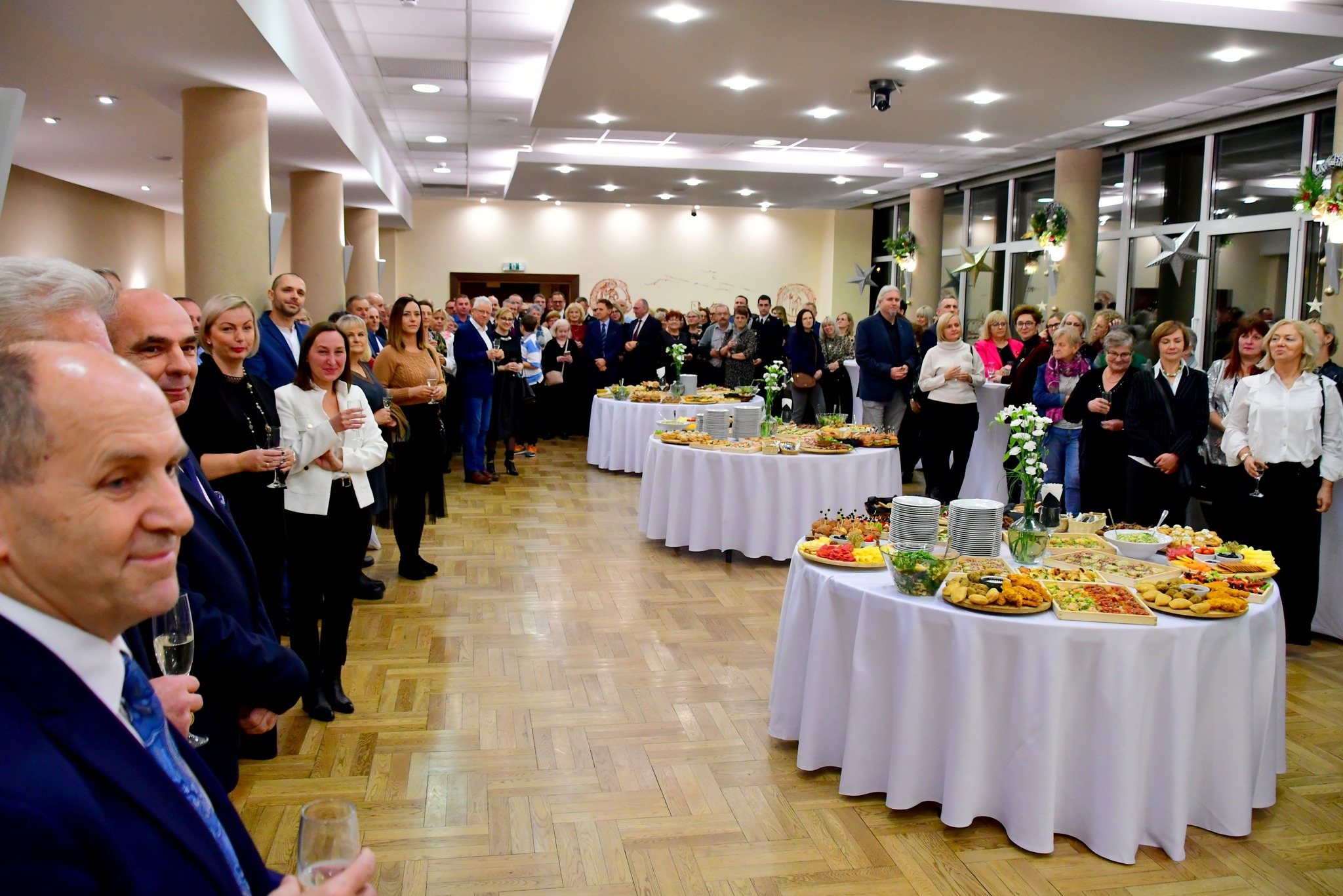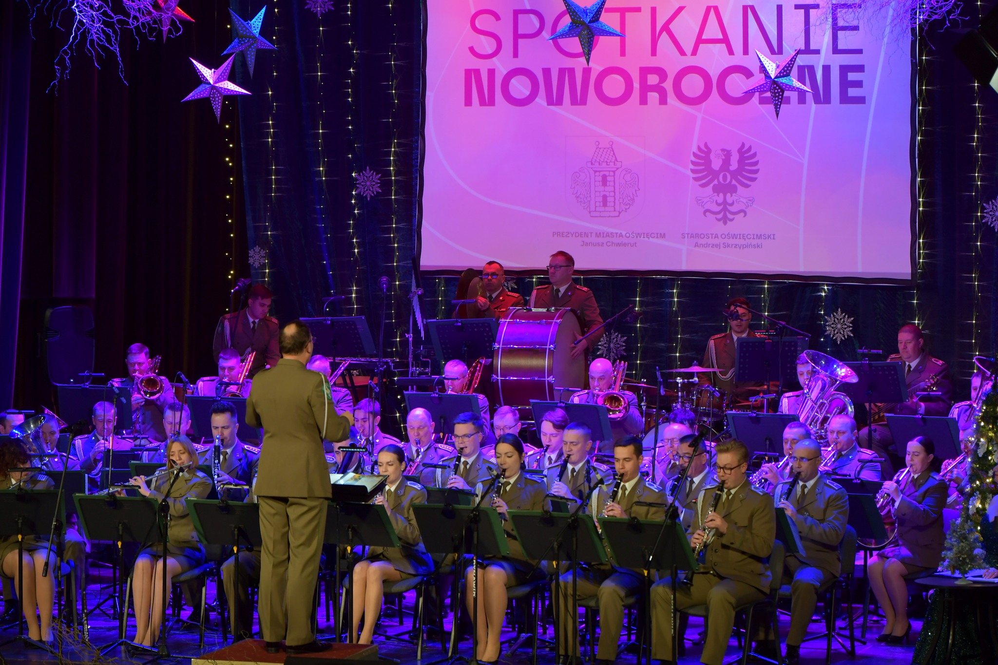 Gospodarze złożyli życzenia, podkreślając współpracę i inwestycje jak S1. Goście, w tym wojewoda, podziękowali za 2025 r. Wieczór uświetnił występ Orkiestry Reprezentacyjnej Straży Granicznej.