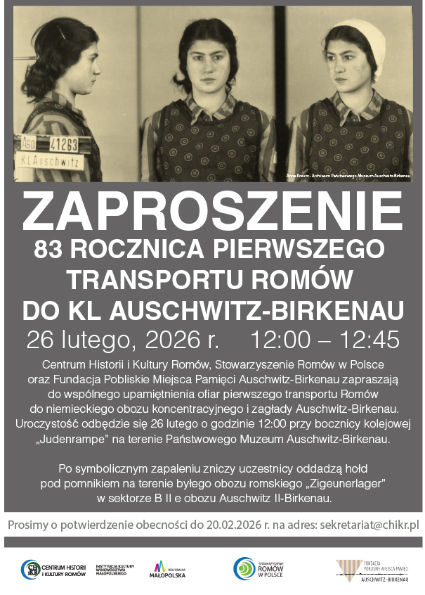 Centrum Historii i Kultury Romów, Stowarzyszenie Romów w Polsce oraz Fundacja Pobliskie Miejsca Pamięci Auschwitz-Birkenau zapraszają do wspólnego upamiętnienia ofiar pierwszego transportu Romów do niemieckiego obozu koncentracyjnego i zagłady Auschwitz-Birkenau.